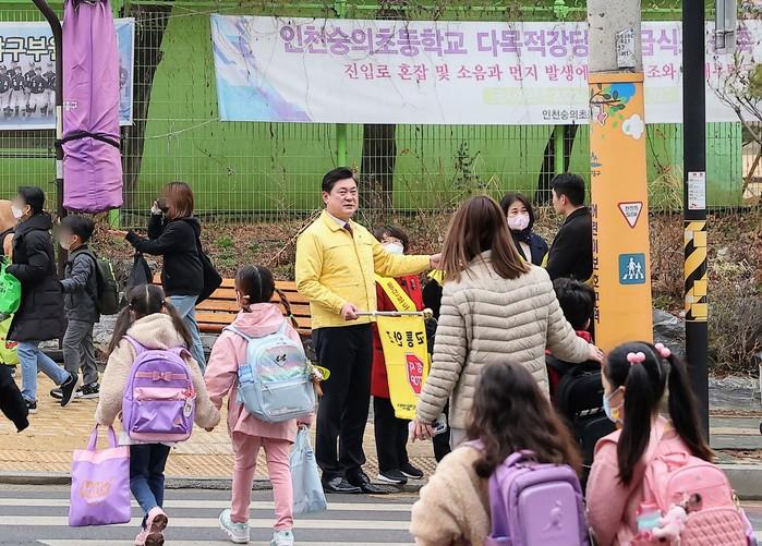 | ▲ 이영훈 구청장(가운데)이 숭의초등학교 등굣길에서 학생들의 등교지도를 하고 있다. (사진=인천 미추홀구청 제공) |