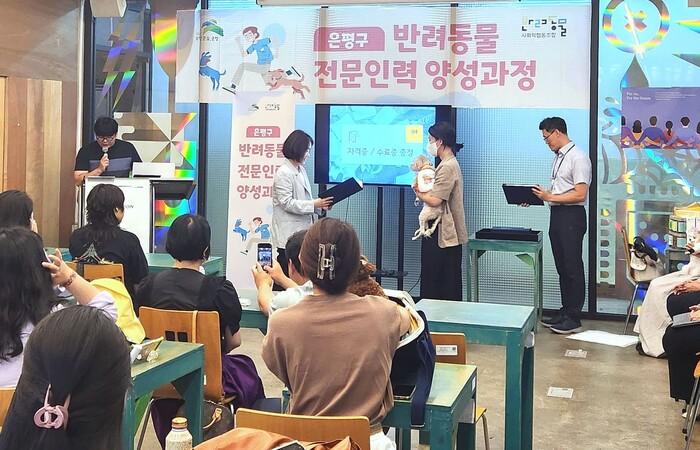 | ▲ 은평구는 지난 15일 서울 혁신파크에서 ‘반려동물 전문인력 양성사업’ 수료식을 개최했다. 사진은 교육 이수생에게 수료증과 반려동물 자격증을 수여하는 모습. (사진=은평구청 제공) |