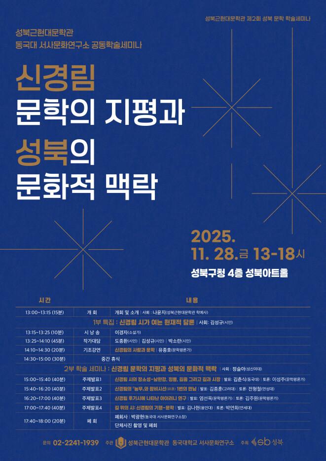 이번 학술세미나는 구청 주최로 진행되며, 신경림 시인의 문학을 통해 인간과 지역, 공동체의 관계를 성찰하고, 그의 시 세계가 담고 있는 공동체적 시선과 성북의 문화적 맥락을 함께 탐구하는 장이 될 전망이다.