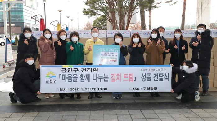 서울 금천구 전직원이 25일 작지만 소중한 마음을 모아 김치(5kg) 359상자를 기탁했다. 후원 물품은 1400만원 상당이며, 10개동 주민센터를 통해 지역 저소득층에 전달될 예정이다. 사진은 전달식에서 유성훈 구청장(왼쪽 다섯 번째)과 직원들이 기념촬영을 하고 있는 모습. (사진제공=금천구청)