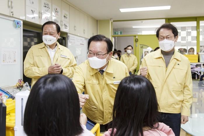 유동균 서울 마포구청장이 김부겸 국무총리, 조희연 서울시 교육감과 함께 2일 새학기를 맞아 마포구 염리초등학교를 방문해 방역사항을 점검했다. 사진은 이날 유 구청장(왼쪽)과 김 총리(가운데)가 학생들과 인사를 하고 있는 모습. (사진제공=마포구청)