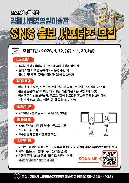 [김해=최성일 기자] 김해시는 오는 4월 개관 예정인 ‘김해시립김영원미술관’을 알리고, 미술관의 개관 과정을 생생하게 기록하고 홍보할 「SNS 홍보 서포터즈」를 모집한다고 밝혔다.