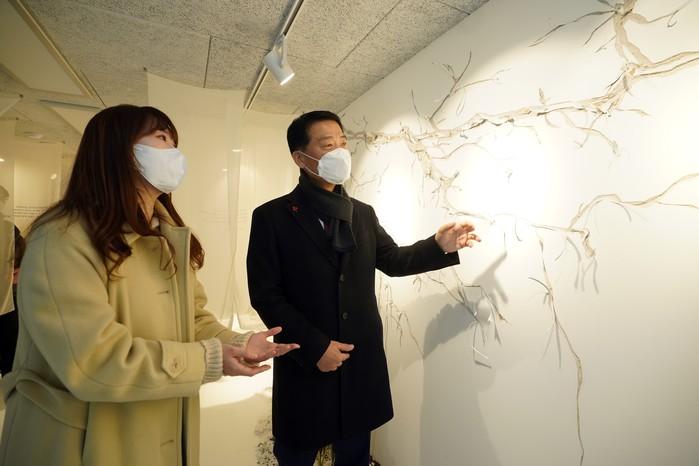 서울 성북구 종암동 문화공간이육사(종암로21가길 36-1)에서 민족시인 이육사의 순국 78주기 특별전 ‘이육사 작품전: 시가 내린 숲’을 오는 2월12일까지 진행한다. 사진은 16일 이승로 구청장(오른쪽)이 홍장오 현대미술가가 재해석한 이육사의 '절정' 작품을 감상하고 있는 모습. (사진제공=성북구청)