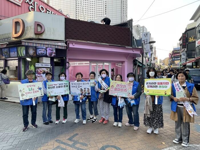 이날 청소년지도협의회 위원들은 청소년 자살 예방에 대한 인식을 높이고, 도움이 필요한 이들에게 희망을 전달하기 위해 성신여대 하나로 거리에서 ‘혼자라면 힘들지만 함께라면 괜찮아!’라는 슬로건으로 자살 예방 안내문과 홍보물을 전달하며 가두 캠페인을 진행했다.