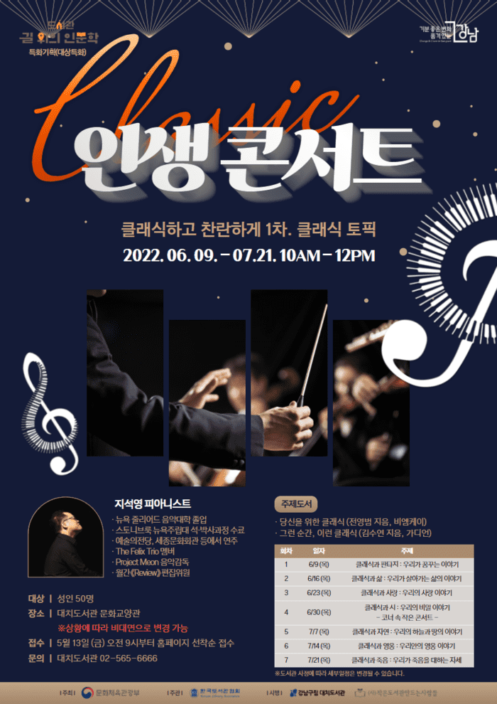 [시민일보 = 이대우 기자] 강남구립 대치도서관이 오는 6월9일~7월21일 ‘인생 콘서트-클래식하고 찬란하게’ 1차 클래식 토픽을 총 7회에 걸쳐 진행한다.