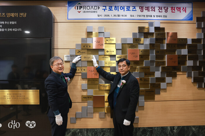 구로구가 26일 ‘제80호 구로히어로즈 명예의 전당 헌액식’을 개최했다. 이날 장인홍 구청장은 구청 창의홀에서 (주)아이피로드에게 사회공헌 인증서를 전달하고, 본관 1층 명예의 전당에 제80호 구로히어로즈 명패를 등재했다. 사진은 헌액식에서 장 구청장(왼쪽)이 명패를 등재하고 기념촬영을 하는 모습. (사진=구로구청 제공)