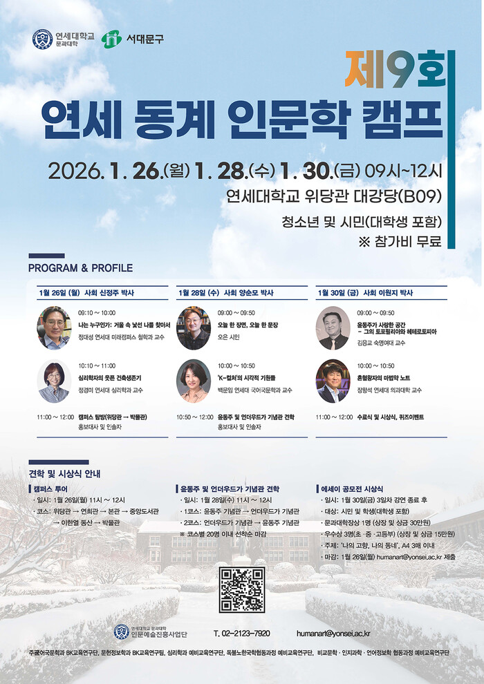 [시민일보 = 이대우 기자] 서울 서대문구(구청장 이성헌)가 연세대학교 문과대학과 공동으로 오는 26일, 28일, 30일 오전 9시부터 낮 12시까지 연세대 위당관 대강당(B09호)과 캠퍼스 일대에서 ‘연세 인문학 캠프’를 개최한다. 이 행사는 2023년 1월 시작돼 이번에 9회를 맞았다.
