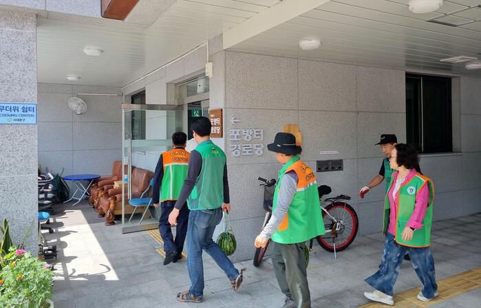 자율방재단원과 새마을지도자협의회원들은 경로당을 방문해 냉방기 등 각종 시설에 대한 안전 점검을 실시하고 수박 나눔 봉사 활동을 펼쳤다.