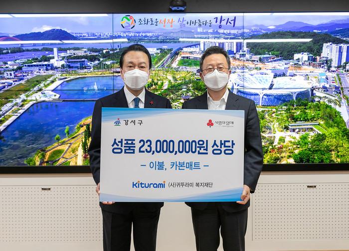 서울 강서구가 최근 (주)귀뚜라미 복지재단으로부터 저소득 주민을 위한 이불 100채·카본매트 50채 등 방한용품을 이웃돕기 성품으로 기탁받았다. 기탁받은 성품은 지역내 홀몸노인 등 저소득 가정에 전달된다. 사진은 전달식에서 노현송 구청장(왼쪽)이 송경석 대표이사 기념촬영을 하고 있는 모습. (사진제공=강서구청)