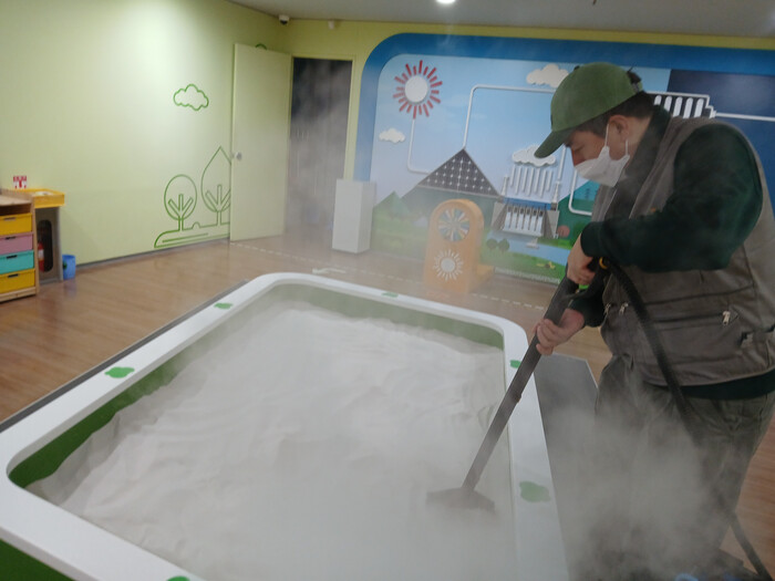 유아의 건강을 고려해 화학 약품 사용을 최소화하고, 고온 스팀을 활용해 인체에 무해한 방식으로 소독을 진행했으며, 특히 유아들의 손이 많이 닿고 이용 빈도가 높은 실내 놀이·체험 공간 전반에 걸쳐 집중적으로 방역을 마쳤다.
