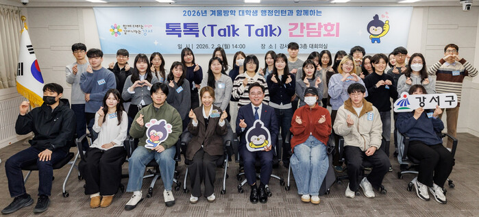 진교훈 서울 강서구청장이 지난 9일 구청 대회의실에서 ‘겨울방학 대학생 행정인턴 톡톡(Talk Talk) 간담회’를 열고 활동을 마친 대학생 35명과 대화를 나눴다. 간담회는 활동 소감 공유 및 구정 발전 방안 제시, 진 구청장과의 대화의 시간 등의 순으로 1시간 동안 진행됐다. 사진은 진 구청장(앞줄 오른쪽 네 번째)이 학생들과 기념촬영하는 모습. (사진=강서구청 제공)
