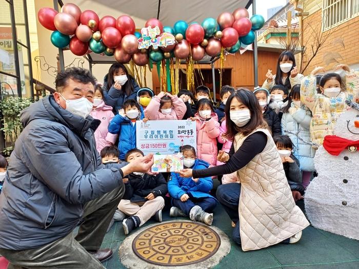 서울 은평구 응암2동은 최근 구립 행복한우리어린이집으로부터 바자회 행사, 원생과 교사들의 자발적인 기부 등으로 마련된 소외계층을 위한 성금 150만원을 전달받았다. 사진은 전달식에서 어린이집 원생 및 관계자들이 기념촬영을 하는 모습. (사진제공=은평구청)