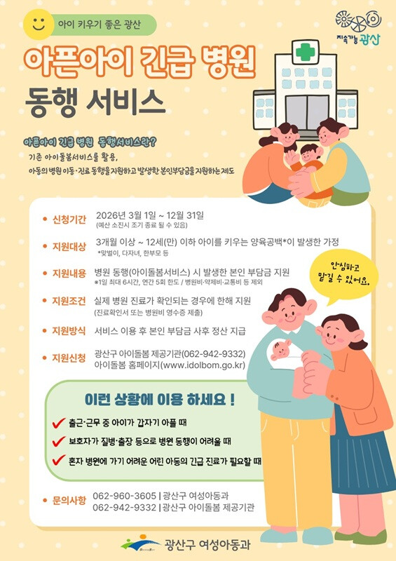 광산구 관계자는 “출근길 아이가 갑자기 열이 날 때 부모님이 느끼는 막막함을 해소하는 것이 이번 사업의 핵심”이라며 “부모가 안심하고 믿을 수 있는 촘촘한 돌봄 체계로 아동의 적기 진료와 건강 회복을 밀착해 지원하며, 가정의 양육 부담도 덜어드리겠다”고 말했다.