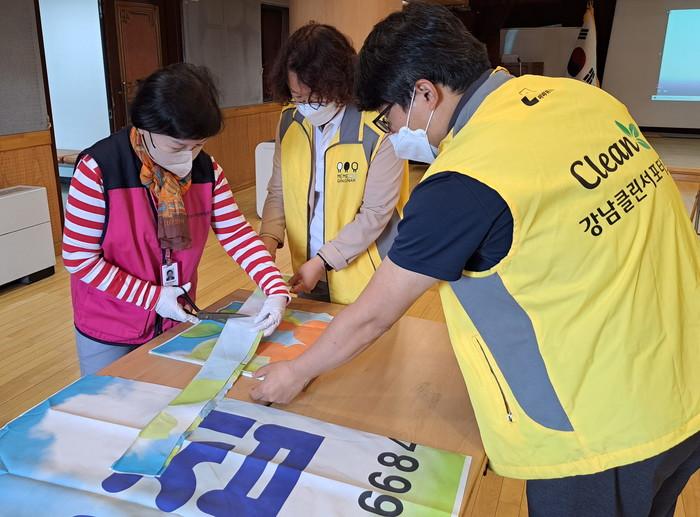 [시민일보 = 이대우 기자] 서울 강남구가 최근 청담동 주민센터 6층 강당에서 제8회 전국동시지방선거 후 버려지거나 환경순찰 과정에서 수거된 폐현수막을 에코백으로 재활용하는 ‘미미위 청담, 현수막에 반하다’ 행사를 개최했다.