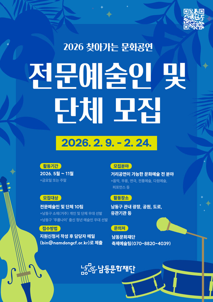 [인천=문찬식 기자] 인천 남동구 남동문화재단은 지역 곳곳을 무대로 펼쳐지는 ‘2026 찾아가는 문화공연’에 참여할 공연 전문예술인 및 단체를 오는 9~24일까지 공개 모집한다고 5일 밝혔다.