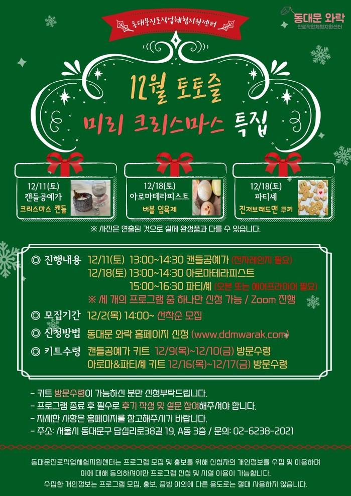 [시민일보 = 이대우 기자] 서울 동대문구(구청장 유덕열)가 2021년 연말을 맞아 지역 청소년을 대상으로 동대문진로직업체험지원센터(이하 동대문 와락)에서 미리 크리스마스 특집 토요직업체험 프로그램을 진행한다고 밝혔다.