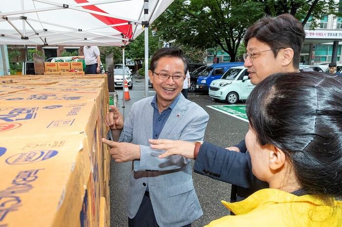| ▲ 최호권 구청장(왼쪽)이 소외된 이웃에게 전달할 물품을 확인하고 있다. (사진=영등포구청 제공) |
