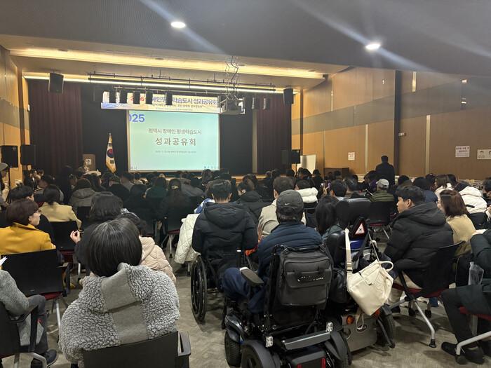 [평택=오왕석 기자] 평택시(시장 정장선)는 지난 25일 평생학습센터 북부학습공간에서 ‘2025년 장애인 평생학습도시 성과공유회’를 열고, 올해 추진한 장애인 평생학습 사업의 성과를 시민과 공유했다. 이날 행사에는 장애인 평생교육 관계자와 학습자 등 140여 명이 참석했으며, 전시·체험·공연 등 다양한 프로그램이 마련됐다.