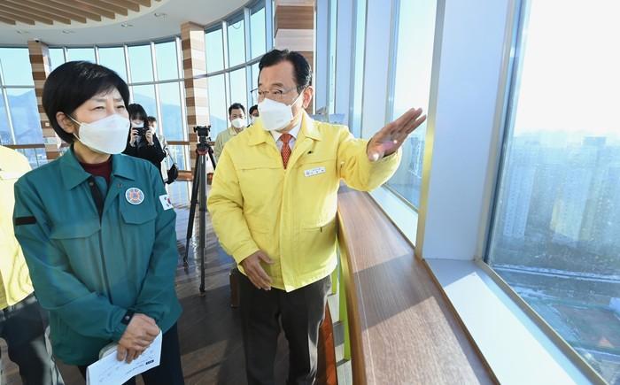 | ▲ 이현재 시장(오른쪽)과 한화진 환경부 장관이 하남시 환경기초시설을 방문해 시설을 둘러보고 있는 모습. (사진제공=하남시청) |