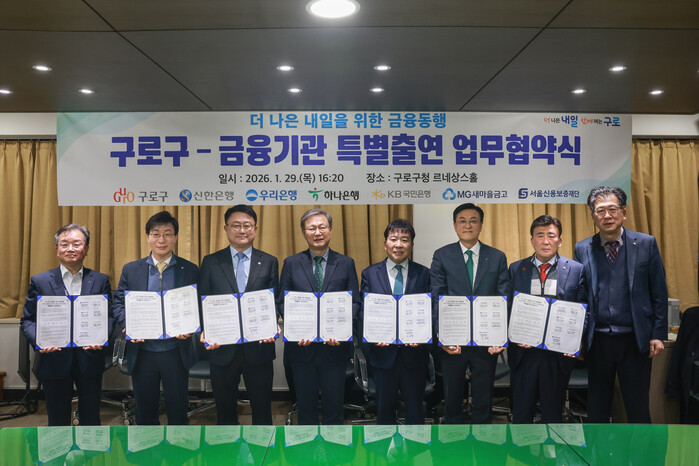 [시민일보 = 박소진 기자] 구로구(구청장 장인홍)가 최근 구청 3층 르네상스홀에서 신한은행, 우리은행, 하나은행, 국민은행, 새마을금고, 서울신용보증재단과 ‘더 나은 내일을 위한 금융동행’ 특별출연 협약을 체결했다.