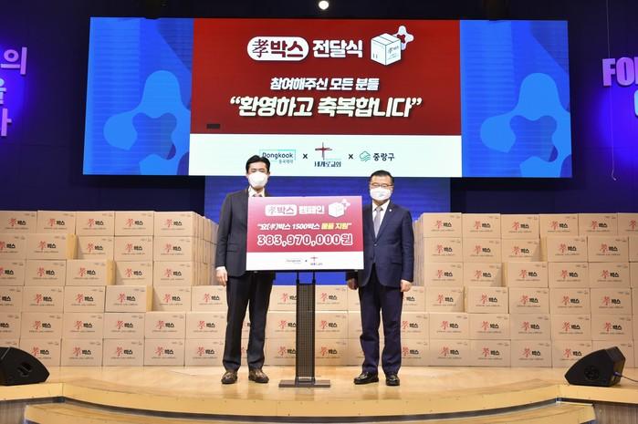 중랑구는 최근 동국제약과 세계로교회로부터 샴푸, 마시는 콜라겐 등으로 구성된 효(孝)박스 1500상자(약 3억8000만원 상당)를 전달받았다. 구는 이 효박스를 지역내 저소득층 홀몸노인들에게 전달할 예정이다. 사진은 전달식에서 류경기 구청장(오른쪽)이 기념촬영을 하는 모습.(사진제공=중랑구청)