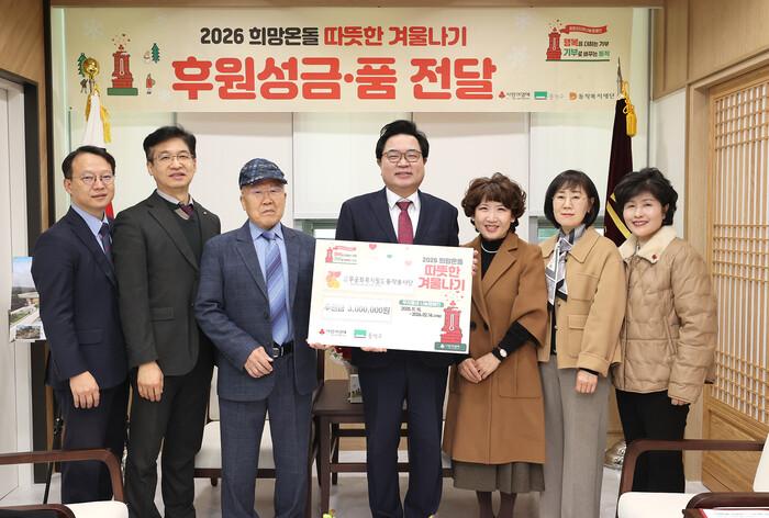 18일 동작구청 신청사에서 무궁화복지월드 동작봉사단 성금 전달식이 진행됐다. 사진은 전달식에 참석한 박일하 구청장(가운데)이 참석자들과 기념촬영을 하고 있는 모습. (사진=동작구청 제공)