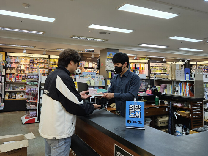 | ▲ 동네서점 희망도서 바로대출 서비스를 이용하는 모습. (사진=노원구청 제공) |
