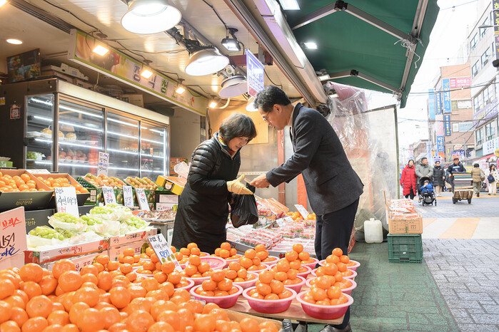 이기재 양천구청장이 최근 설 명절을 앞두고 전통시장과 골목형상점가, 경로당 등 주요 민생 현장을 잇달아 방문하며 주민과 소통하고, 현장의 목소리를 직접 살폈다. 사진은 목동깨비 전통시장에서 과일을 구매하고 있는 이 구청장(오른쪽)의 모습. (사진=양천구청 제공)