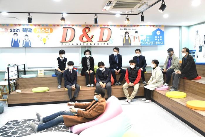 최근 서울 노원구 경기기계공고에서 '학교 내 쉼터 뚝딱' 개소식이 개최됐다. 경기기계공고는 창고로 이용하던 도서관 옆 유휴교실을 학생들의 아이디어를 반영해 휴식과 연극을 할 수 있는 공간으로 리모델링했다. 사진은 이날 개소식에 참석한 오승록 구청장(뒷줄 왼쪽 세 번째)이 관계자들과 시설을 둘러보고 있는 모습. (사진제공=노원구청)