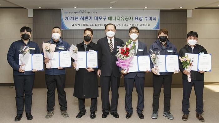 서울 마포구가 지난 13일 '2021년 하반기 에너지 유공자 표창 수여식'을 열고 유공자 6명에게 표창을 수여했다. 에너지 유공자 표창은 에너지 분야 최일선에서 안정적인 에너지 공급과 사용시설의 안전한 관리에 힘 써준 이들에게 주어진다. 사진은 이날 수여식에서 유동균 구청장(가운데)이 수여자들과 기념촬영을 하는 모습. (사진제공=마포구청)