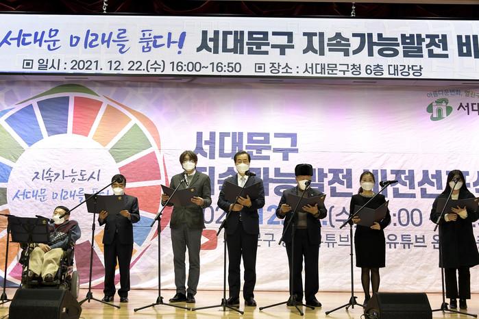 서울 서대문구는 지난 22일 ‘지속가능도시 서대문 미래를 품다!’란 캐치프레이즈 아래 지속가능발전 비전선포식 개최했다. 행사에서는 인간웰빙 및 역량 강화 등 7대 전략이 포함된 비전선언문을 낭독했다. 사진은 이날 문석진 구청장(왼쪽 네 번째)과 참석자들이 비전선언문을 낭독하는 모습. (사진제공=서대문구청)