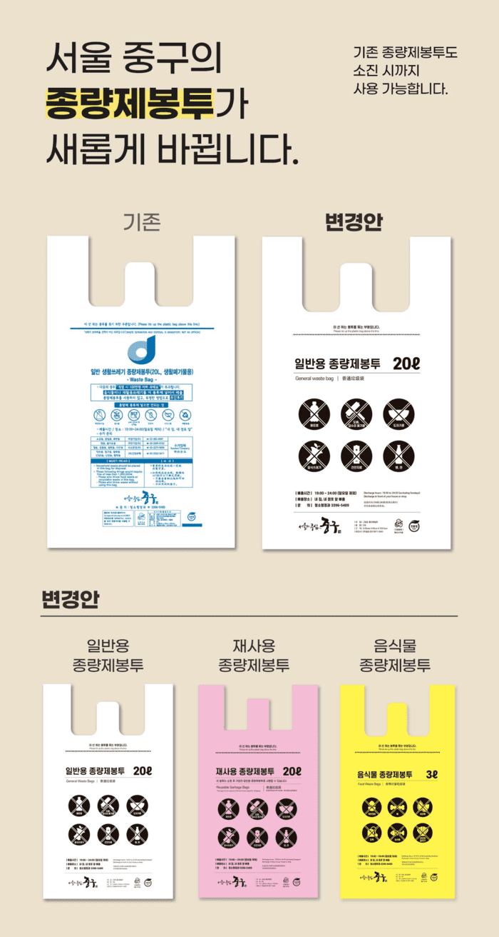 이번에 구가 새로 내놓은 봉투 디자인은 일반용, 재사용, 음식물용 등 3종이다. 봉투 색상은 주민들에게 익숙한 기존 색상(흰색, 분홍색, 노랑색)을 유지하고 그림은 검정으로 통일해 깔끔함을 더했다.