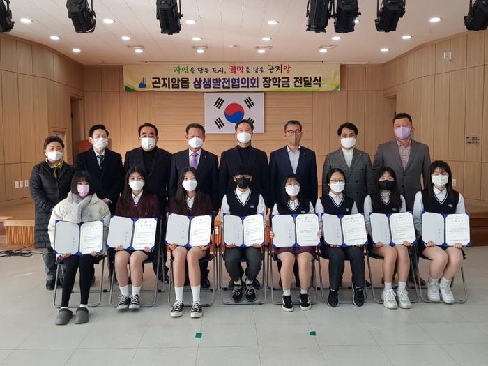 경기 광주시 곤지암읍 상생발전협의회가 최근 지역인재 지원을 위한 장학금 전달식을 열고 학교 추천을 받은 곤지암중학교 졸업 예정자 8명에게 총 400만원의 장학금을 전달했다. 사진은 장학금 전달식에서 학생 및 관계자들이 기념촬영을 하고 있는 모습. (사진제공=광주시청)