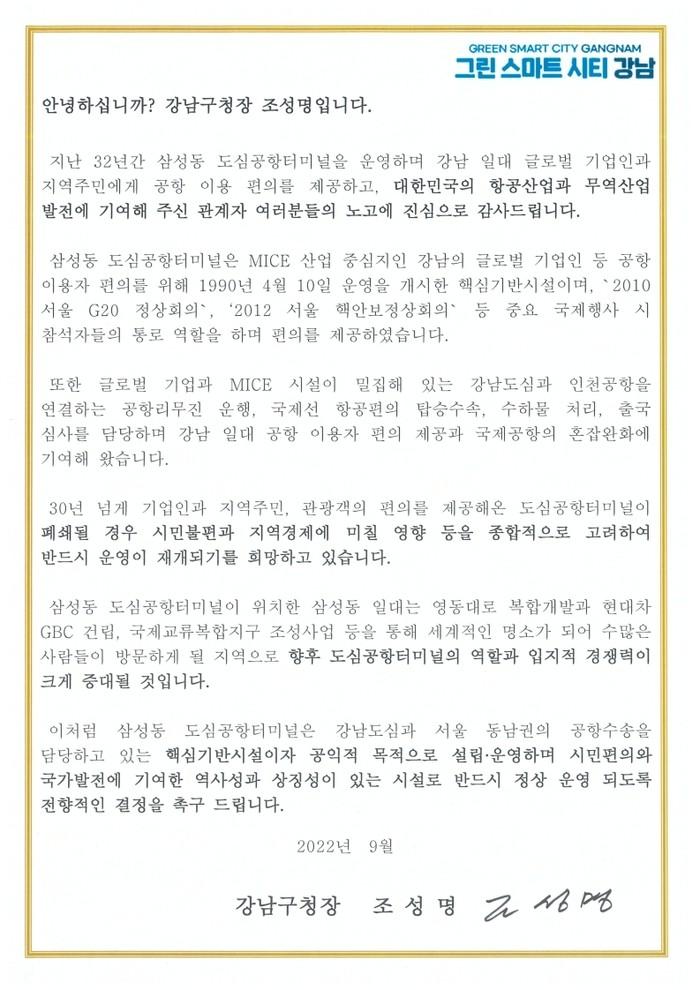 조 구청장 명의의 서한문에는 최근 언론보도 등을 통해 알려진 삼성동 도심공항터미널의 폐쇄 논란과 관련해 터미널이 폐쇄될 경우 공항을 찾는 시민들의 불편과 지역경제에 미칠 영향을 우려해 도심공항터미널의 운영이 정상적으로 재개되도록 관계기관의 전향적인 결정을 촉구하는 내용이 담겼다.