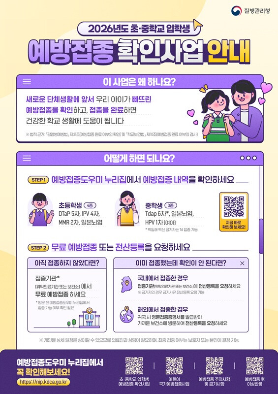일본뇌염 백신은 초·중학교 입학생이 완료해야 하는 예방접종 중 하나다. 자녀의 접종 여부는 ‘예방접종도우미’ 누리집, 또는 모바일 앱에서 간편하게 확인할 수 있으며, 누락된 접종이 있을 경우 가까운 지정 의료기관이나 보건소에서 무료로 접종 받을 수 있다.