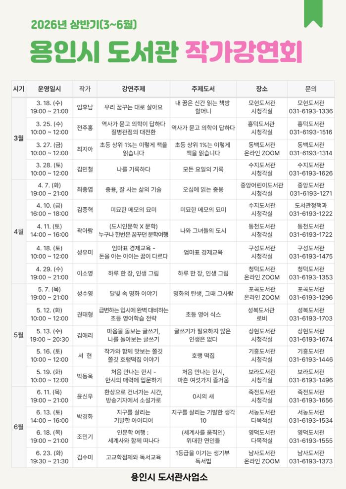5월에는 7일 '명화의 탄생 그때 그 사람’의 저자 성수영 한국경제 기자(포곡도서관), 12일 '초등 영어 식스'의 저자 권태형 작가(성복도서관), 13일 '글쓰기가 필요하지 않은 인생은 없다'의 저자 김애리 작가(상현도서관), 16일 ‘호랭 떡집’의 저자 서현 작가(기흥도서관), 19일 ‘처음 만나는 한시 마흔 여섯가지 즐거움‘의 저자 박동욱 한양대 교수(보라도서관)가 강연할 예정이다.