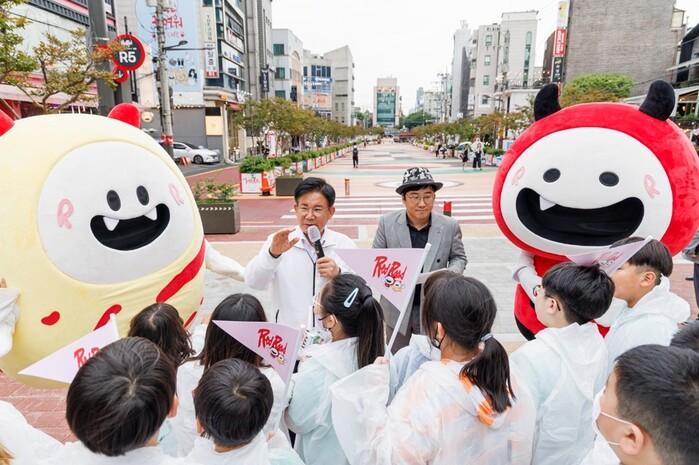 | ▲ 지난 6월 레드로드 캐릭터 깨비깨순과 함께 어린이 역사프로그램을 진행하는 박강수 마포구청장. (사진=마포구청 제공) |
