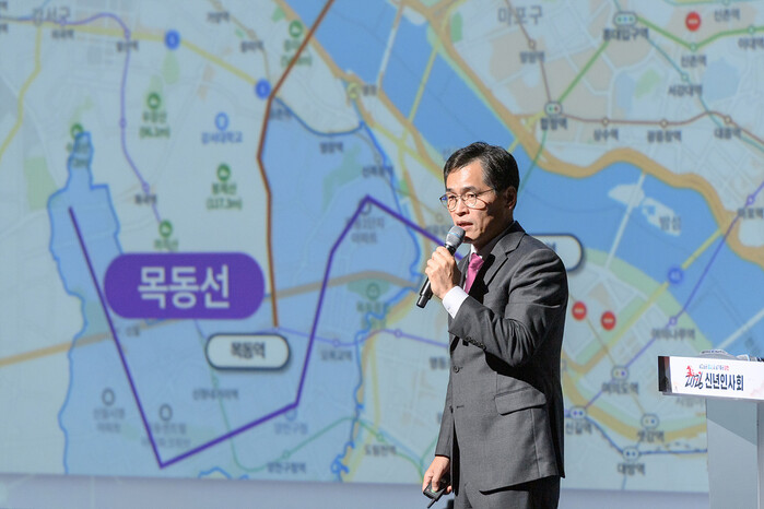 양천구가 7일 양천문화회관 대극장에서 ‘2026년 신년인사회’를 개최하고 새해 구정 목표와 운영 방향을 주민과 함께 공유하며 병오년의 힘찬 출발을 알렸다. 사진은 신년인사회에서 주요 정책을 발표 중인 이기재 구청장의 모습. (사진=양천구청 제공)