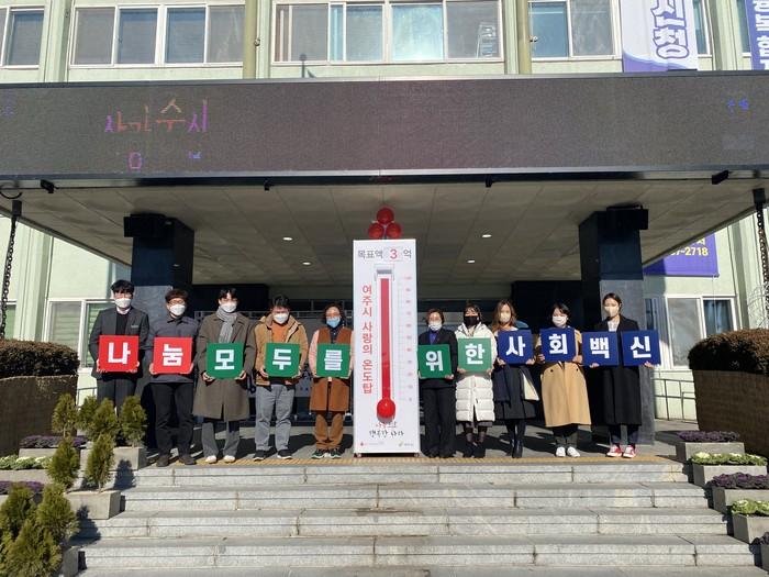 경기 여주시와 경기 사회복지공동모금회가 최근 '희망2022 나눔캠페인'의 일환으로 사랑의 온도탑을 설치하고 오는 2022년 1월31일까지 운영한다. 목표액은 3억원이며, 모금액은 시 지정기탁금으로 적립돼 지역내 복지대상자 등에 사용될 예정이다. 사진은 이날 관계자들이 기념촬영을 하는 모습. (사진제공=여주시청)
