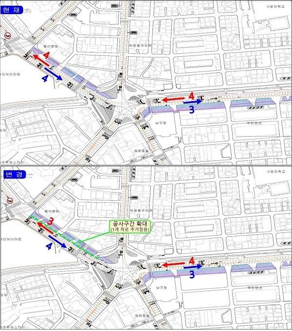 | ▲ 백운광장 주변 교통전환도 변경 전(상단)과 변경 후(하단) / 광주광역시 제공 |
