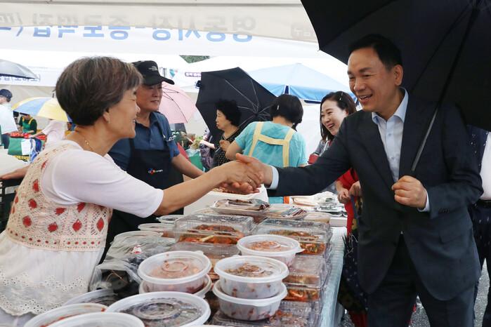 | ▲ 추석맞이 직거래 장터에서 상인들과 인사를 나누는 조성명 강남구청장 (사진=강남구청 제공) |