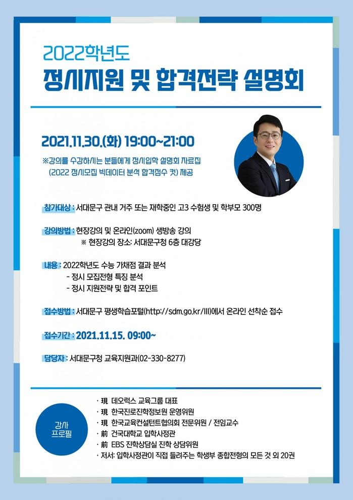 [시민일보 = 홍덕표 기자] 서울 서대문구(구청장 문석진)가 오는 30일 오후 7시부터 9시까지 지역내 수험생과 학부모를 대상으로 '2022학년도 정시 지원 및 합격 전략 설명회'를 개최한다.