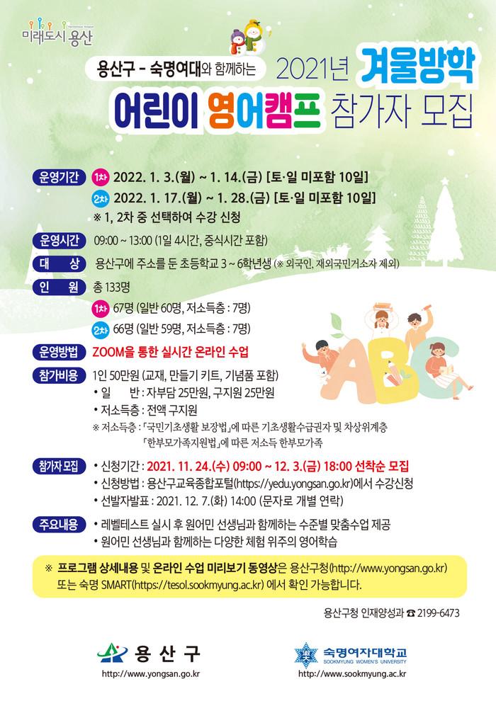 | ▲ 2021년 겨울방학 어린이 영어캠프 안내문. (사진제공=용산구청) |