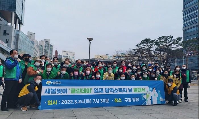 서울 금천구는 지난 24일부터 매월 넷째주 목요일을 ‘클린데이’로 지정하고, 구민들이 많이 이용하는 다중이용시설·지하철 역사 등 주요 시설을 대상으로 주기적인 일제 방역소독을 실시한다. 사진은 지난 24일 발대식에서 유성훈 구청장(앞줄 가운데)과 참가자들이 기념촬영을 하는 모습. (사진제공=금천구청)