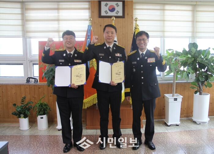 박춘천 서장은 소방경으로 승진한 직원들(소방경 김성화, 김현호)에게 임용장을 수여하고 승진 대상직원들은 승진에 따른 사명감과 책임감을 새롭게 다짐했다.