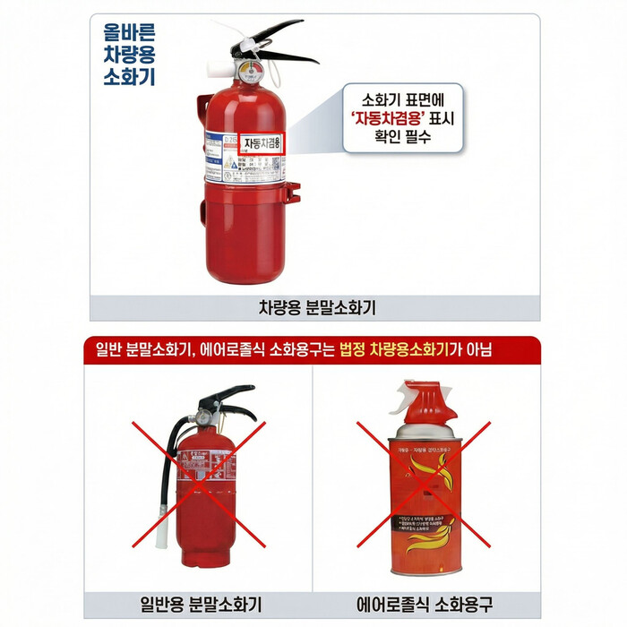 차량용 소화기는 진동과 고온 환경에서도 성능을 유지할 수 있도록 설계된 ‘자동차 겸용’ 표시가 있는 제품을 구매해야 한다. 또한 화재 발생 시 운전자가 즉시 사용할 수 있는 곳에 설치 또는 비치하는 것을 권장한다.
