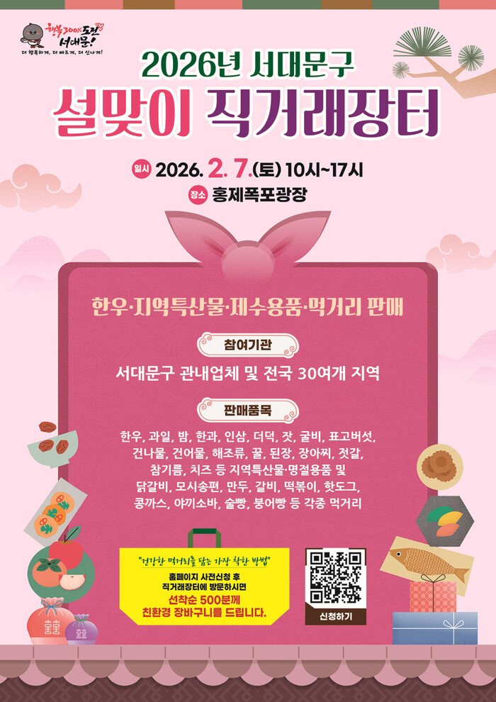 [시민일보 = 이대우 기자] 서대문구(구청장 이성헌)가 설 명절을 앞두고 시민에게 안전하고 품질 좋은 명절 먹거리를 합리적 가격에 제공하기 위해 오는 2월7일 오전 10시~오후 5시 홍제폭포광장에서 ‘2026년 설맞이 직거래장터’를 개최한다.