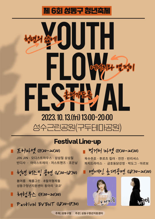 올해로 6회째를 맞는 성동구 청년축제는 ‘청년플로우(Youth Flow)’라는 주제로 진행된다. 이는 청년의 삶에 에너지와 열정이 잘 흘러가기를 바라고 축제를 통해 에너지를 받고 열정이 생길 수 있도록 하자는 의미로, 청년과 지역주민 모두가 하나되는 축제로 만들어가고자 한다.