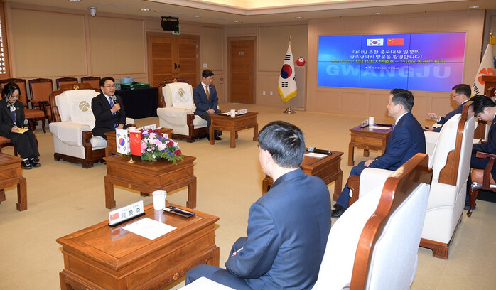 | ▲ 강기정 광주광역시장(왼 쪽 두 번째)이 6일 시청 비즈니스룸에서 다이빙(戴兵) 주한 중국대사와 한·중 지방정부 간 교류·협력 강화 방안을 논의하고 있다. /광주광역시 제공 |