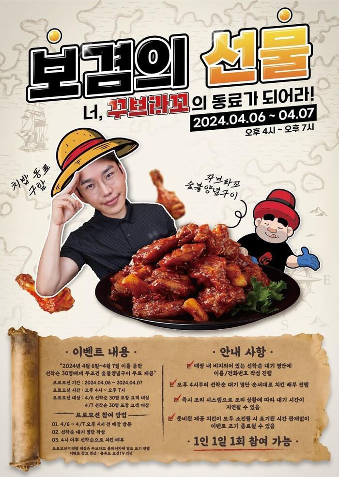4월 6일(토)부터 7일(일)까지 양일간 꾸브라꼬숯불두마리치킨 전국 매장에서 동시에 실시된 이번 보겸과의 콜라보 이벤트는 매장 별 포장고객 30명에게 인기메뉴인 숯불양념구이를 증정하는 내용으로 진행됐다.